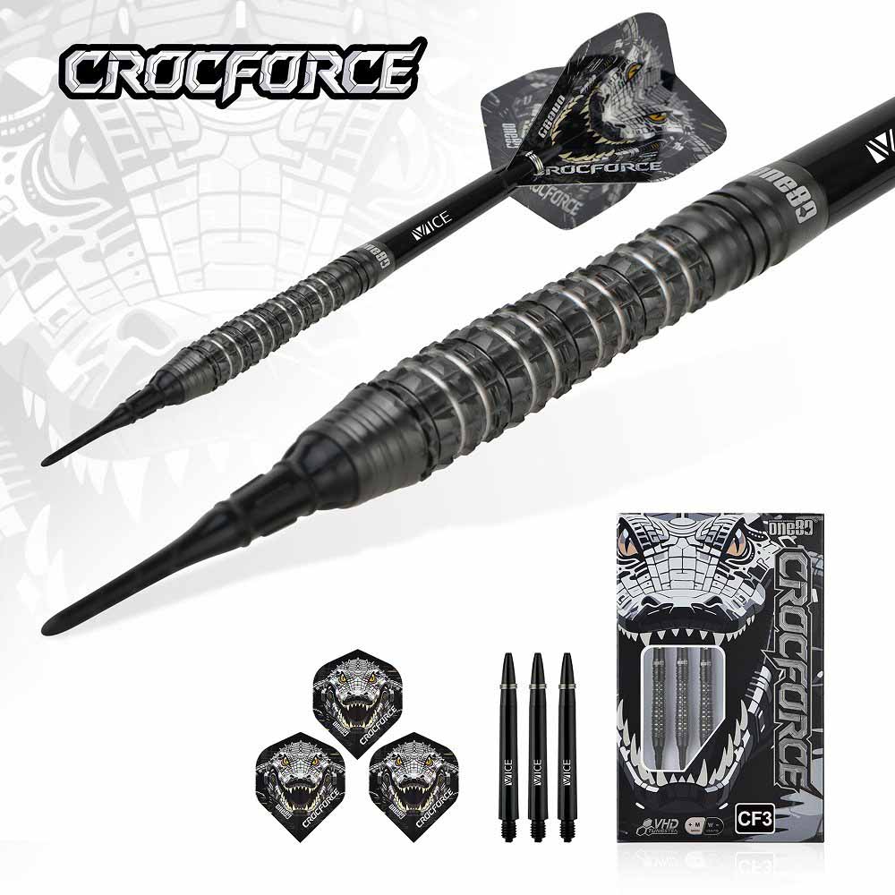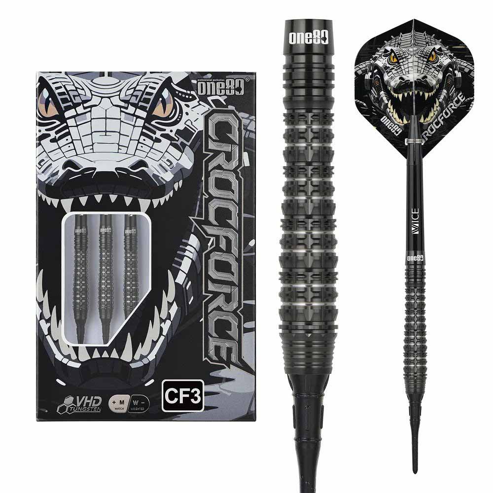 Marca: One 80. Modelo: Crocforce. Version: CF3. Largo Barril: max 43.5mm. Diámetro Barril: max 6.5mm. Peso del cuerpo: 18 gramos. Material Barril: 90% Tungsteno. . El juego de dardos Crocforce CF2 se compone por 1 set de 3 cuerpos, 1 set de 3 cañas , 1 set de 3 plumas y 1 set de 3 puntas 2ba.