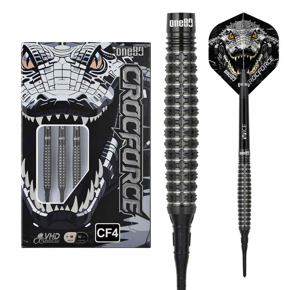 Marca: One 80. Modelo: Crocforce. Version: CF4. Largo Barril: max 44.5mm. Diámetro Barril: max 7.6mm. Peso del cuerpo: 20 gramos. Material Barril: 90% Tungsteno. . El juego de dardos Crocforce CF4 se compone por 1 set de 3 cuerpos, 1 set de 3 cañas , 1 set de 3 plumas y 1 set de 3 puntas 2ba.