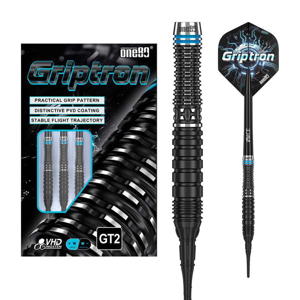 Marca: One 80. Modelo: Griptron . Versión: GT2. Largo Barril: 46.5mm. Diámetro Barril: 7mm. Peso del cuerpo: 18 gramos. Material Barril: 90% Tungsteno. . El juego de dardos Griptron GT2 se compone por 1 set de 3 cuerpos, 1 set de 3 cañas y 1 set de 3 plumas
