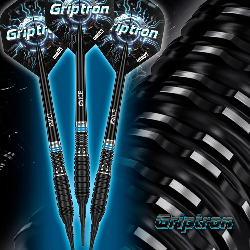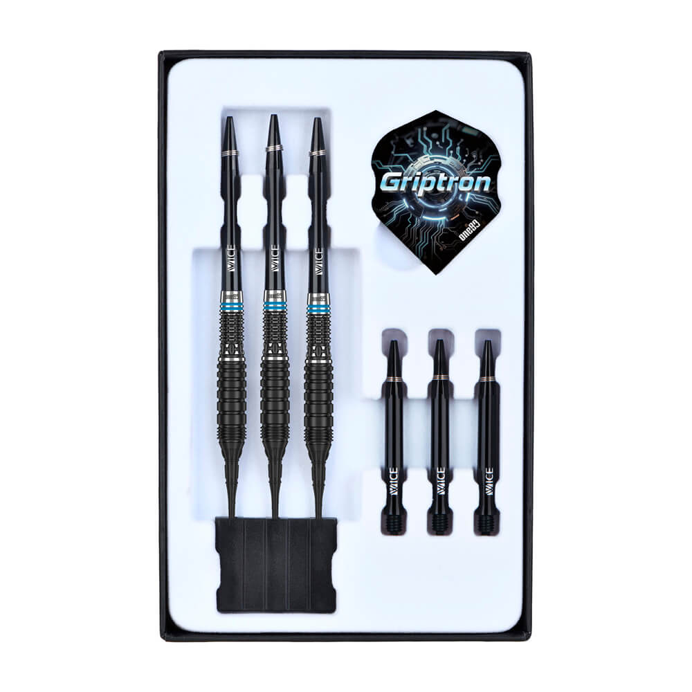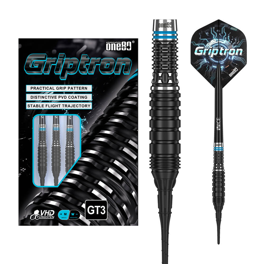 Marca: One 80. Modelo: Griptron . Versión: GT3 . Largo Barril: 39.5mm. Diámetro Barril: 7.8mm. Peso del cuerpo: 20 gramos. Material Barril: 90% Tungsteno. . El juego de dardos Griptron GT3 se compone por 1 set de 3 cuerpos, 1 set de 3 cañas y 1 set de 3 plumas