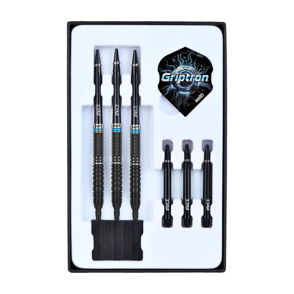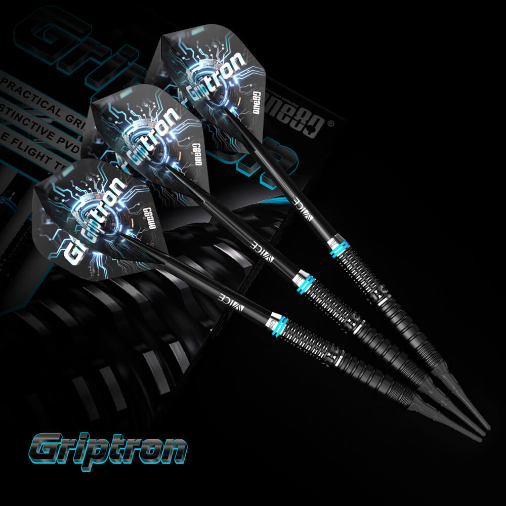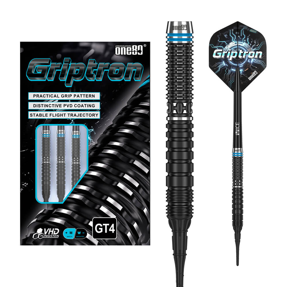 Marca: One 80. Modelo: Griptron . Versión: GT4. Largo Barril: 47.5mm. Diámetro Barril: 6.7mm. Peso del cuerpo: 20 gramos. Material Barril: 90% Tungsteno. . El juego de dardos Griptron GT4 se compone por 1 set de 3 cuerpos, 1 set de 3 cañas y 1 set de 3 plumas