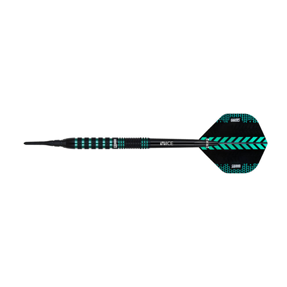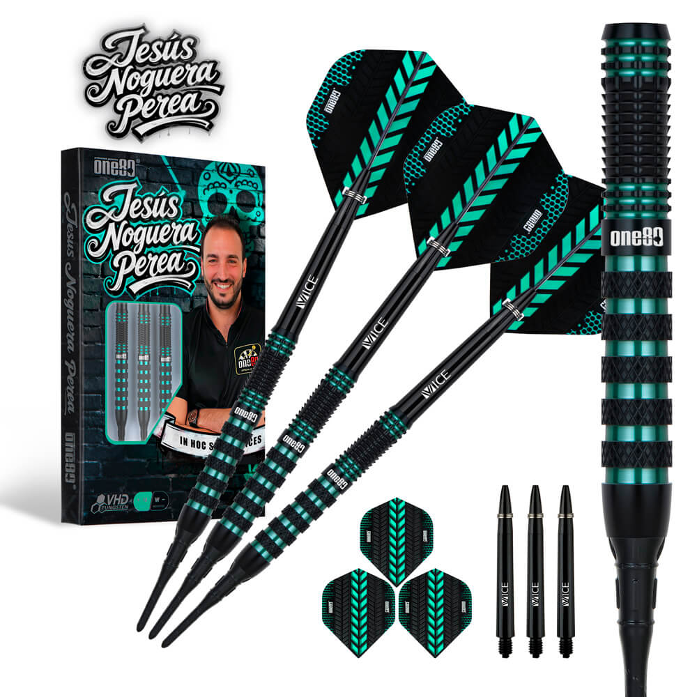 Marca: One 80. Modelo: Jesus Noguera Perea. Versión: Softip . Largo Barril: 48.4mm. Diámetro Barril: 6.6mm. Peso del cuerpo: 18 gramos. Material Barril: 90% Tungsteno. . El juego de dardos Jesus Noguera Perea se compone por 1 set de 3 cuerpos, 1 set de 3 cañas y 1 set de 3 plumas