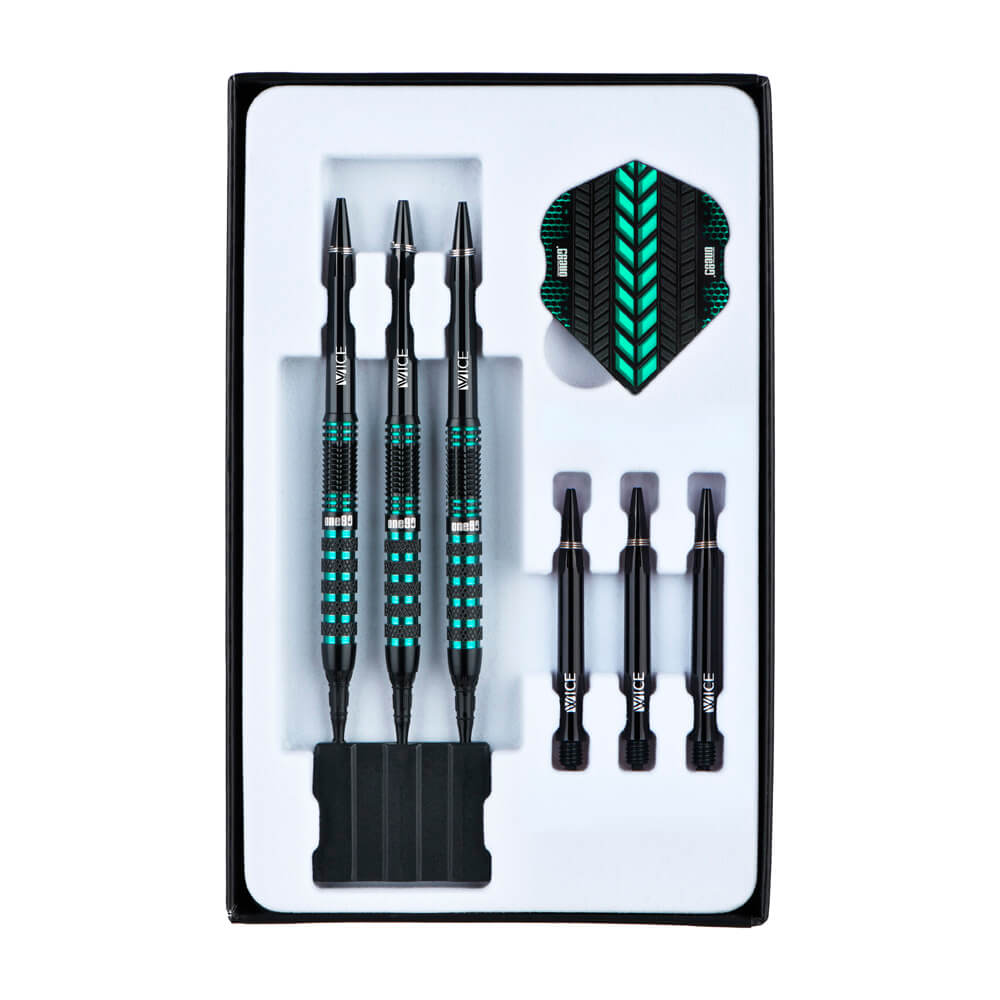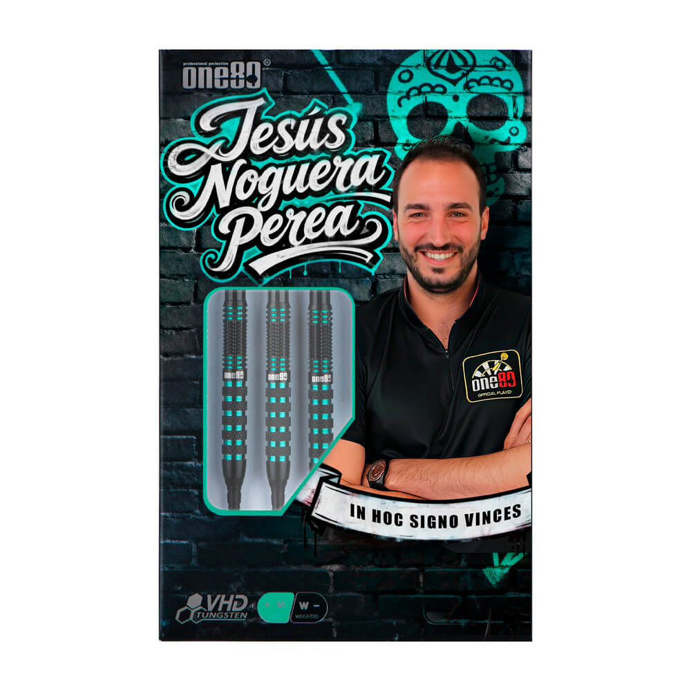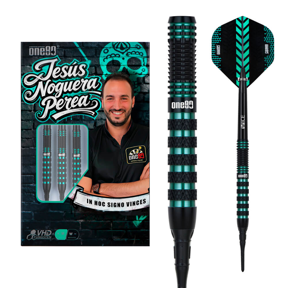 Marca: One 80. Modelo: Jesus Noguera Perea. Versión: Softip . Largo Barril: 48.4mm. Diámetro Barril: 6.6mm. Peso del cuerpo: 20 gramos. Material Barril: 90% Tungsteno. . El juego de dardos Jesus Noguera Perea se compone por 1 set de 3 cuerpos, 1 set de 3 cañas y 1 set de 3 plumas