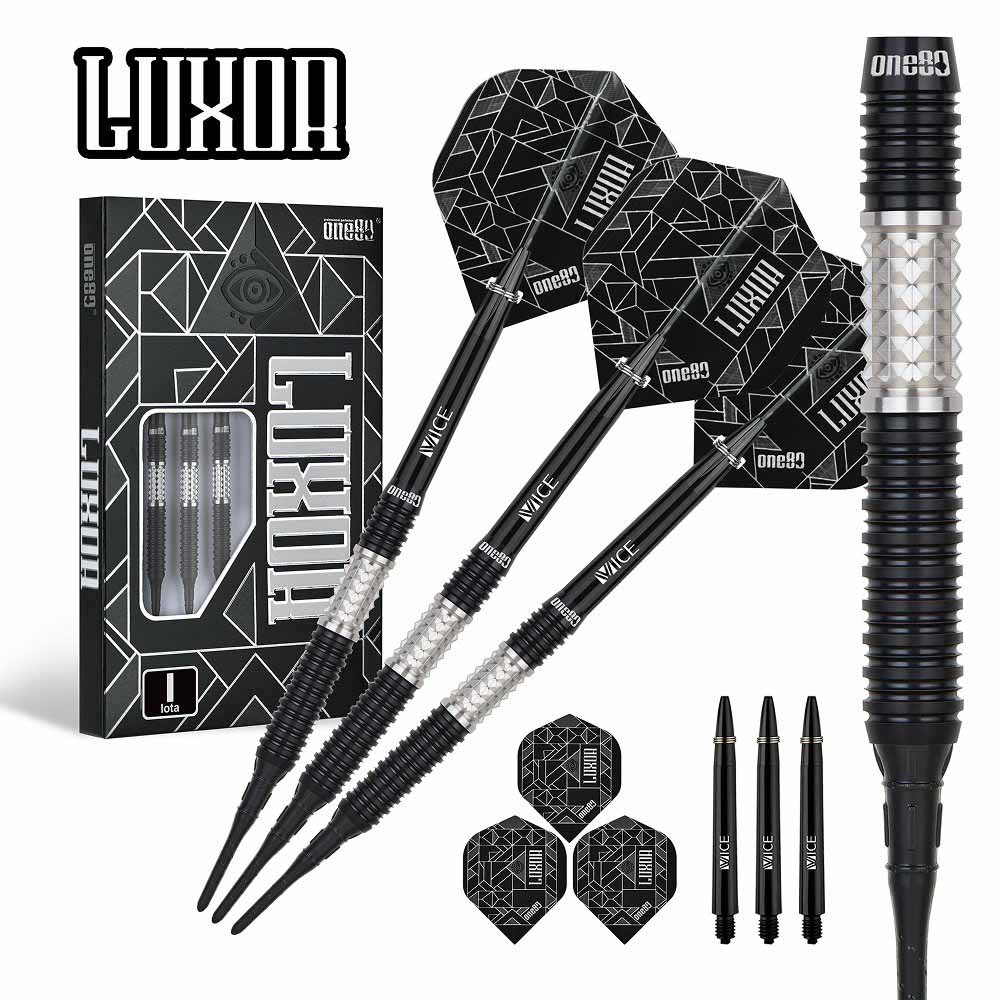 Marca: One 80. Modelo: Lota. Version: II. Largo Barril: max 46.0mm. Diámetro Barril: max 6.6mm. Peso del cuerpo: 18 gramos. Material Barril: 90% Tungsteno. . El juego de dardos Luxor Lota II se compone por 1 set de 3 cuerpos, 1 set de 3 cañas , 1 set de 3 plumas y 1 set de 3 puntas 2ba.