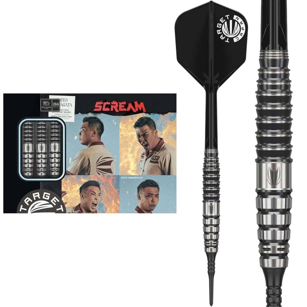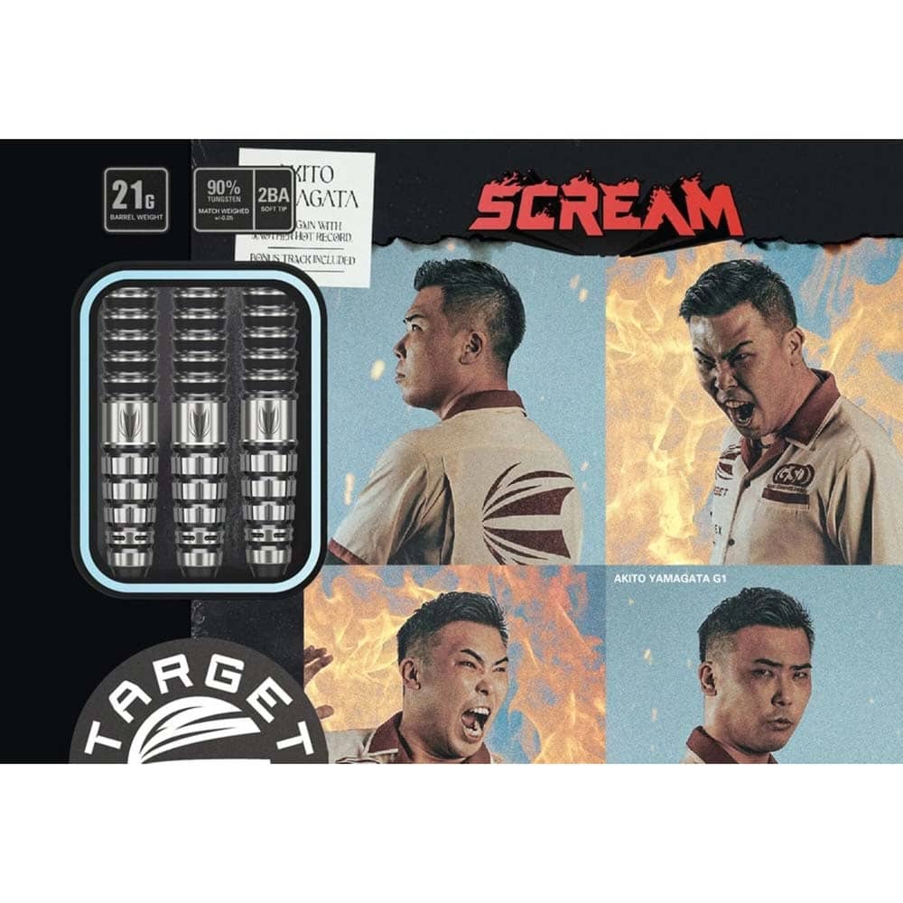 Marca: Target Japan. Modelo: Prime Series Scream G1 Max. Diseño: Akito Yamagata. Peso barril: 21 gramos. Material: Tungsteno 90%. Longitud barril: 45.00mm. Diámetro barril: 7.80mm. Tipo de punta: Punta plástico rosca 2ba. Rosca de la caña: 2BA. . El juego de dardos se compone por 1 set de 3 cuerpos Target Japan Prime Series Scream G1 Max, 1 set de 3 plumas K-Flex Target Japan y 3 puntas 2ba Target Pixel Tip.
