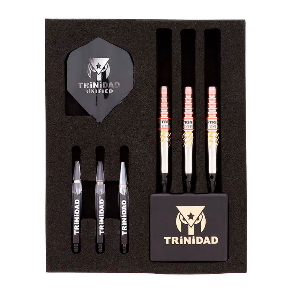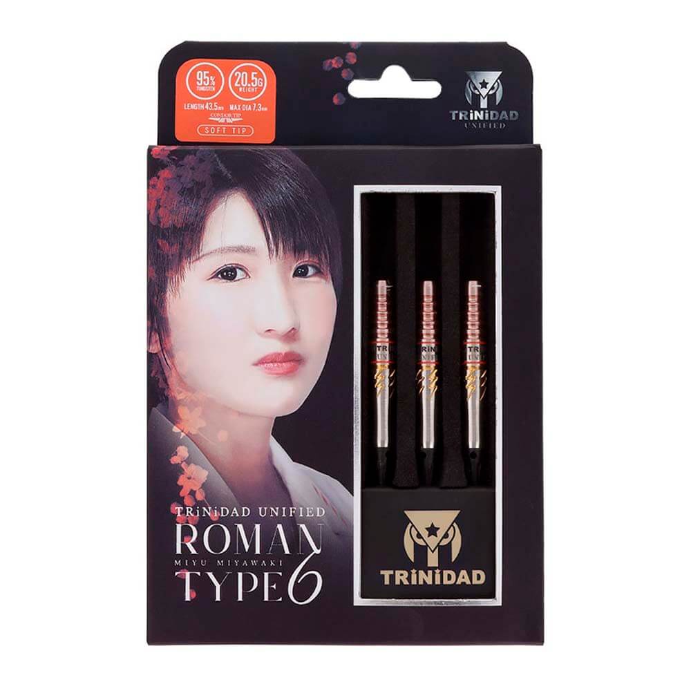 Marca: Trinidad. Modelo: Roman Type6. Diseño: Miyu Miyawaki. Peso del barril: 20.5gr. Material: 95% Tungsteno. Longitud barril: 43.5mm. Diámetro barril: 7.3mm. Tipo de punta: Plástico rosca 2ba 4mm. . El juego de dardos se compone por 1 set de 3 cuerpos Trinidad Roman Type6, 1 set de 3 plumas Trinidad, 1 set de 3 cañas Trinidad y 3 puntas de plástico 2ba.