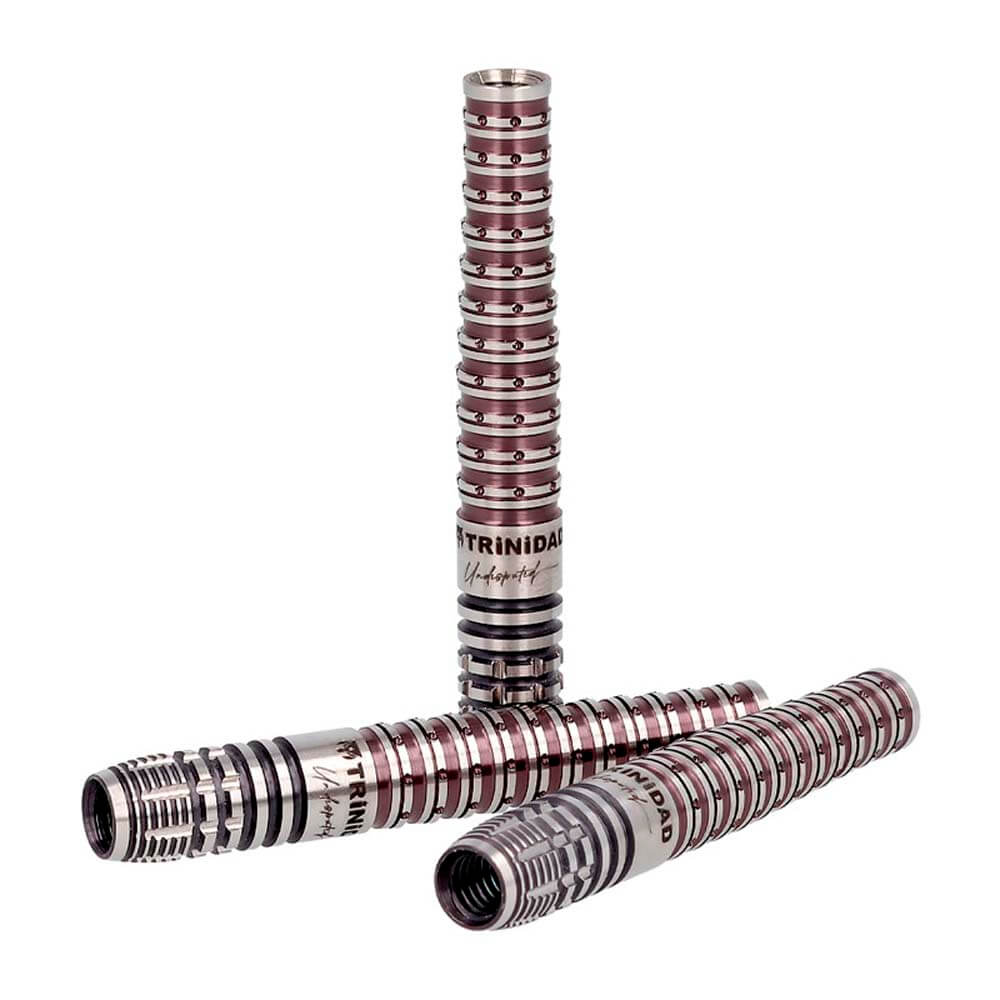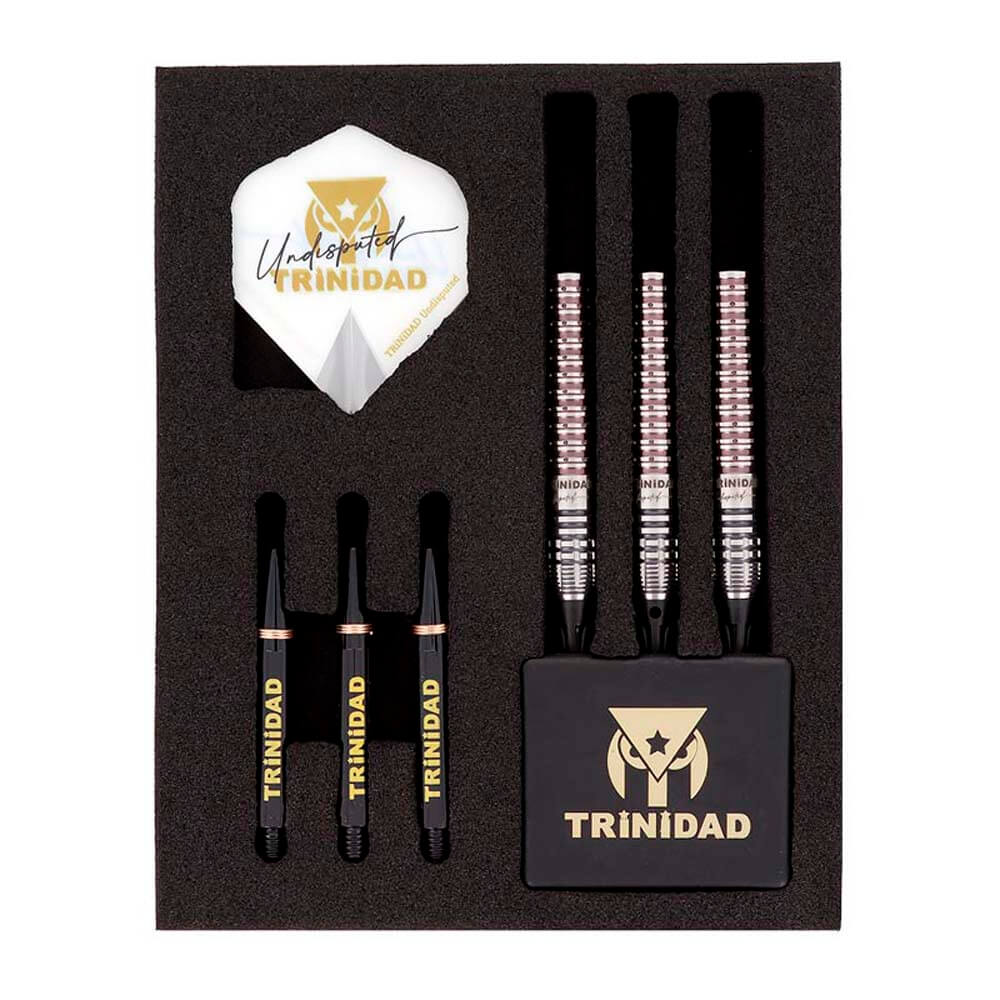 Marca: Trinidad. Modelo: Undisputed KID Type3. Diseño: Tomoya Goto. Peso del barril: 21gr. Material: 90% Tungsteno. Longitud barril: 48.0mm. Diámetro barril: 7.1mm. Tipo de punta: Plástico rosca 2ba 4mm. . El juego de dardos se compone por 1 set de 3 cuerpos Trinidad Undisputed KID Type3, 1 set de 3 plumas Trinidad, 1 set de 3 cañas Trinidad y 3 puntas de plástico 2ba.