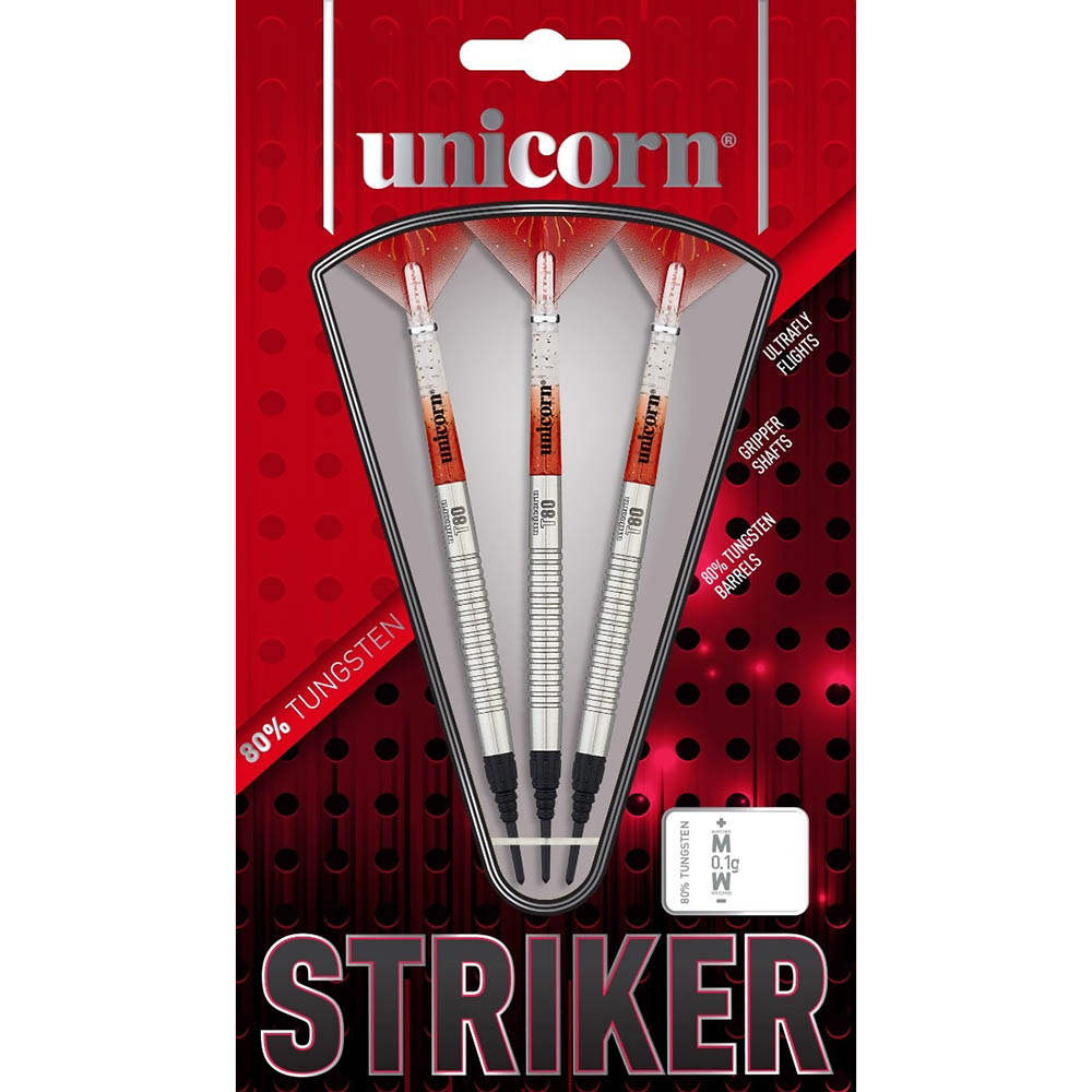Marca: Unicorn. Modelo: Striker . Peso total: 22g. Largo 45.7mm. Diámetro 7.3mm. Rosca caña: 2ba. Rosca punta: 2ba. Modalidad punta : punta plástico. . El juego de dardos se compone por 1 set de 3 cuerpos Striker 80% , 1 ser de 3 cañas, 1 set de 3 plumas y 3 puntas 2ba 4mm