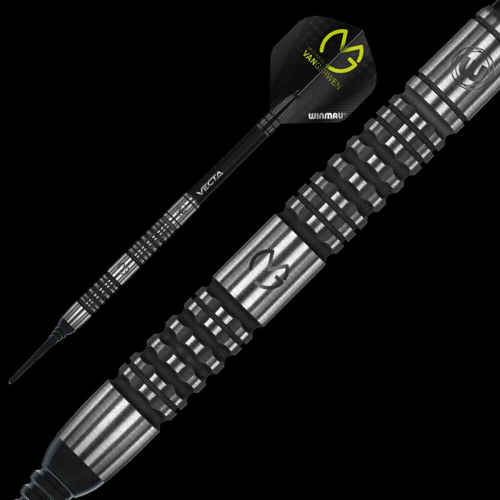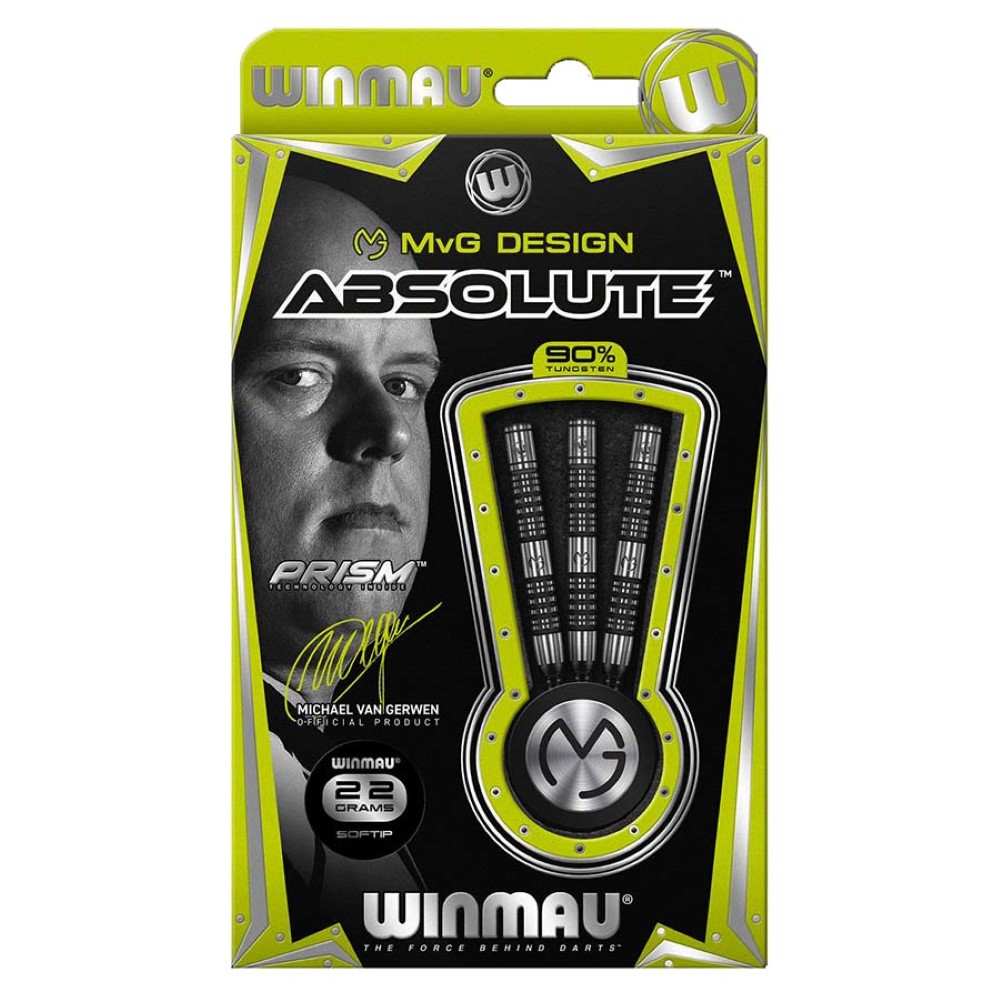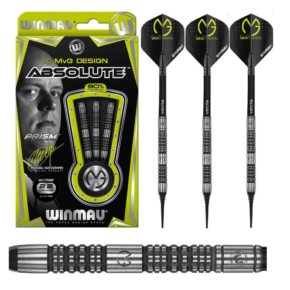 Dardos fabricados por Winmau modelo Michael Vangerwen Absolute MvG Design el producto es un juego completo de 3 dardos. Largo total: 50.8mm. plastico. Diámetro: 6.3mm. Peso total: 22g. Tungsteno: 90%