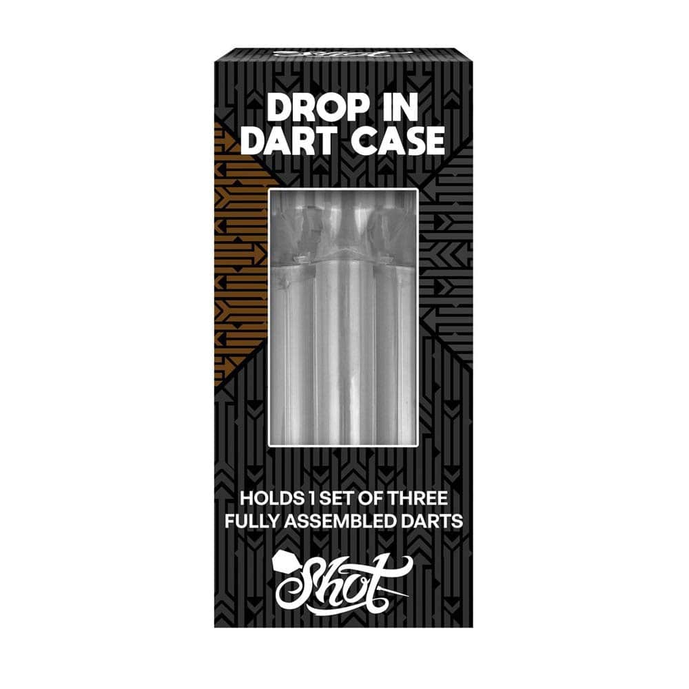 Marca Shot. Modelo Drop In. Longitud del estuche: ajustable de 15,5 cm a 21 cm. Ancho del área del estuche de transporte: 6,5 cm. Color: Transparente. . El producto se compone por 1 Funda de dardos Shot Darts Drop In, no incluye dardos ni accesorios, es solo la funda.