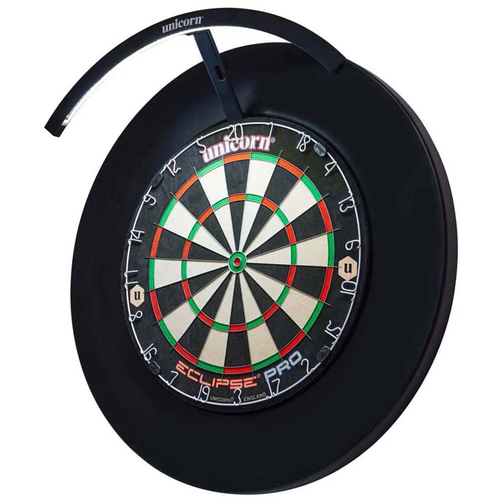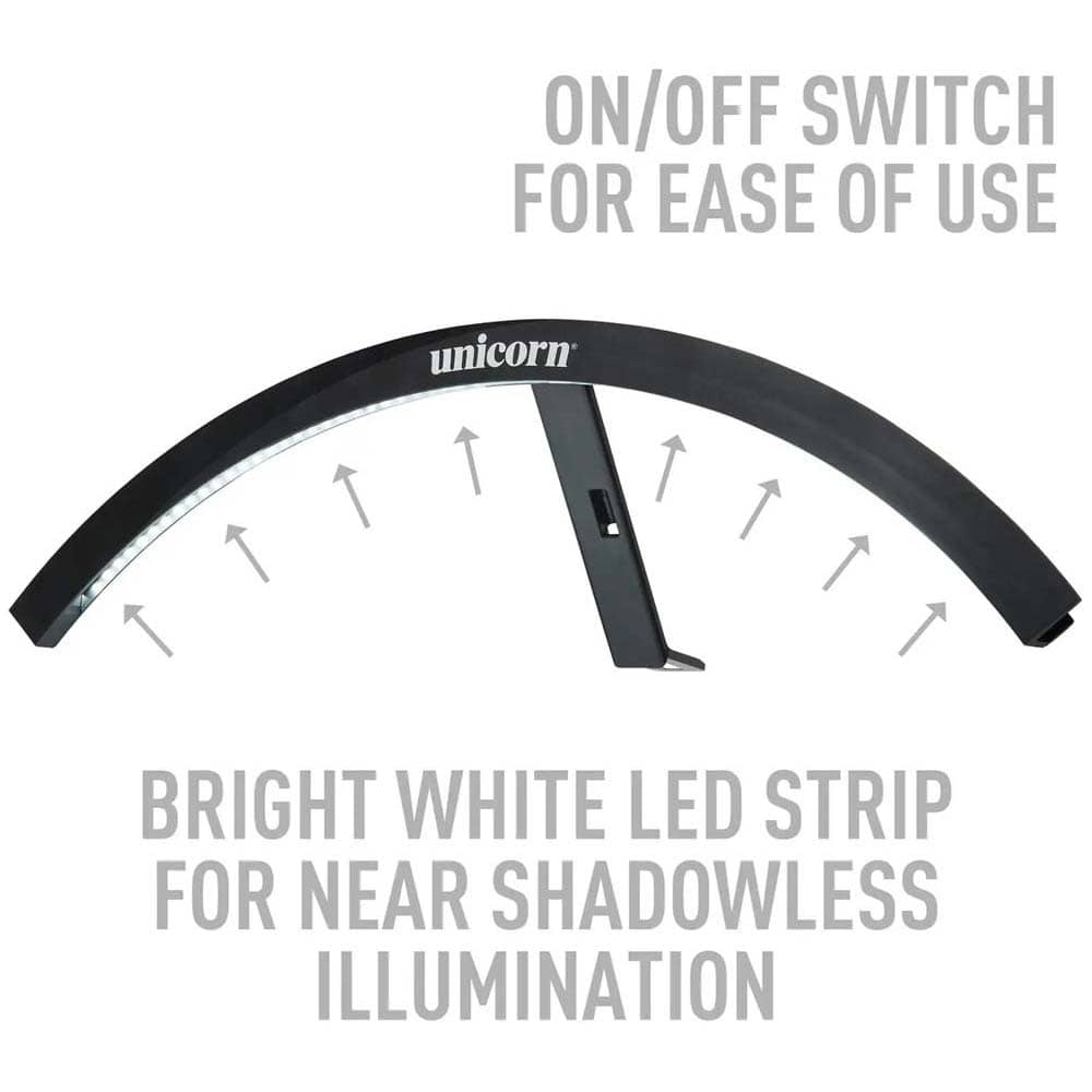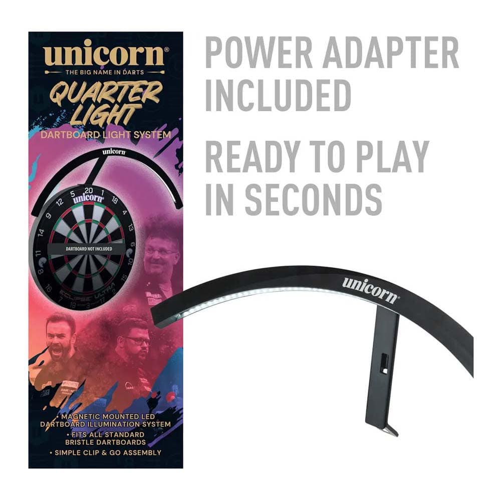 Marca Unicorn. Modelo Solar Beam LED Quarter Light. Arco de iluminación de 90°. Luz LED brillante para una iluminación casi sin sombras.. Diseño ligero.. Fácil de montar.. Se fija al instante a cualquier diana tradicional mediante imán.. Interruptor de encendido y apagado de fácil acceso.. Se puede usar con o sin marco o surround.. Fuente de alimentación transformador universal.. Ilumina tu diana en segundos.. . No incluye diana, ni dardos, es es solo el sistema de iluminación.