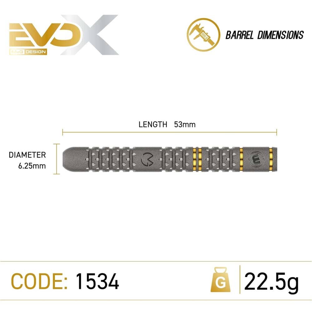 Marca: Winmau. Modelo: Michael van Gerwen Evo-X . Material: Tungsteno 90%. Peso total: 22.5gr. Longitud barril: 53.0mm. Diámetro barril: 6.25mm. Tipo de punta: Punta Metal. Rosca de la caña: 2ba 4mm. . El juego de dardos Winmau Michael van Gerwen Evo-X, se compone por 1 set de 3 cuerpos con punta de acero, 1 set de 3 plumas Prism Delta y 1 set de 3 cañas Vecta corta