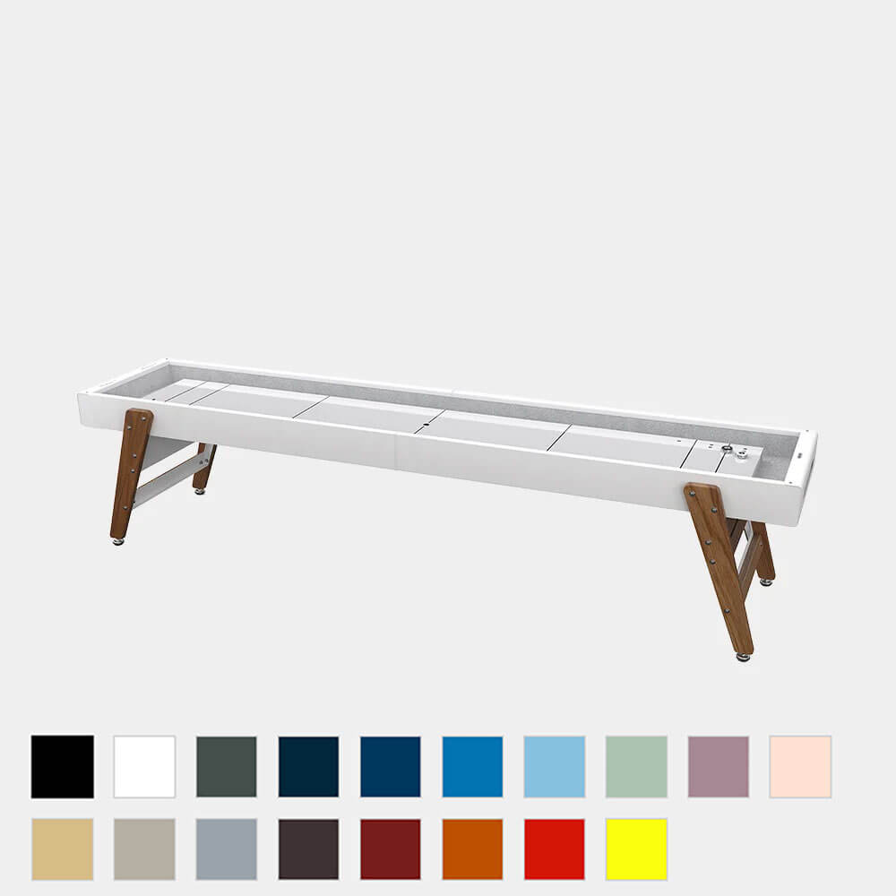 En el juego, como en la vida, hay que atreverse. Retar los límites establecidos sin sobrepasarlos. Lanzarse con la fuerza precisa para alcanzar el borde sin caer. Sentir el hormigueo del riesgo sin perder. Así es exactamente el shuffleboard Track. Track se arriesga a romper los clichés del shuffleboard clásico con un diseño de líneas mínimas y de belleza firme e imponente. Se atreve a innovar con la rudeza del acero como protagonista indiscutible del terreno de juego. Track te marca un reto en la distancia. Solo la pista te separa de tu anhelo de victoria. La precisión de tu lanzamiento une el origen y el destino: el juego. El shuffleboard Track está disponible en dos medidas: 9 y 12 pies para adaptarse a las dimensiones del espacio. Y, con el sobre de cristal, Track Dining shuffleboard es a la vez pista de juego y mesa alta. Y es que el juego, con unos aperitivos y bebidas para compartir, tiene otro sabor. Estructura: Acero con cataforesis y pintura poliéster con acabado micro texturado. Campo de juego: Acero con cataforesis y pintura poliéster y resina epoxi bicomponente. Patas: Madera de iroko certificada FSC/PEFC. Recubrimiento interior: Textel Echo 9 100% PET (60% reciclado. Medidas 9 Pies(LxWxH) 274,3×80,8×83,5 cm / 108×31.8×33 in Peso 135 kg / 298 lb Disponible en 18 colores, 1- Negro Azabache, 2-Blanco Tráfico, 3-Verde Nórdico, 4-Azul Acero , Azul Verdoso 5-Azul Frío,6- Azul Cielo, 7-Verde Salvia, 8- Violeta Pastel, 9-Rosa Melocotón, 10-Beige Verdoso,11- Gris Seda, 12-Gris Window, 13-Marrón Grisáceo, 14-Marrón Grisáceo, 15-Burdeos, 16-Terracota, 17-Rojo Tráfico, 18-Amarillo Azufre. En una de las imagen del producto ponemos la carta de colores. Incluye Set de 8 pucks y cera en polvo para shuffleboard. El color elegido por favor anotarlo en comentarios al finalizarl el pedido—– Plazo de entrega: 8-10 semanas.—–